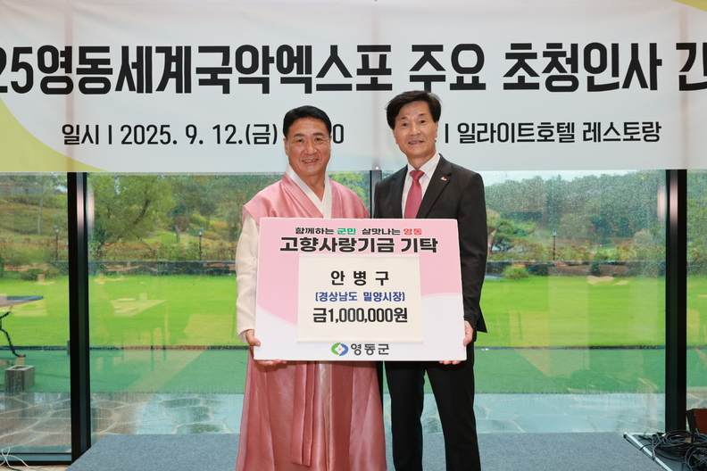 안병구 밀양시장(왼쪽)이 12일 영동세계국악엑스포 개막식에 참석해 고향사랑기부금 100만 원을 정영철 영동군수(오른쪽)에게 전달하고 있다.