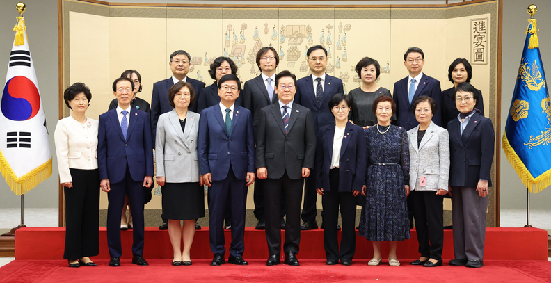 이재명 대통령이 15일 용산 대통령실에서 임명장 수여식 참석자 및 가족들과 기념촬영을 하고 있다. 이날 이 대통령은 이석연 국민통합위원장, 김진애 국가건축정책위원장, 김호 농어업농어촌특별위원장에게 위촉장을, 최교진 교육부 장관, 원민경 여가부 장관, 차정인 국가교육위원장, 주병기 공정거래위원장, 이억원 금융위원장에게 임명장을 수여했다.