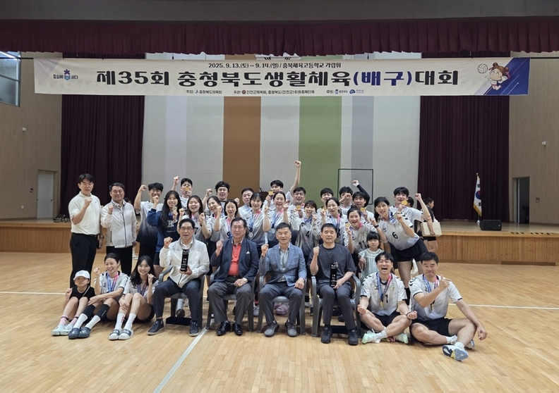 35회 충북생활체육대회에 출전한 청주시 배구팀이 기념 촬영을 하고 있다.