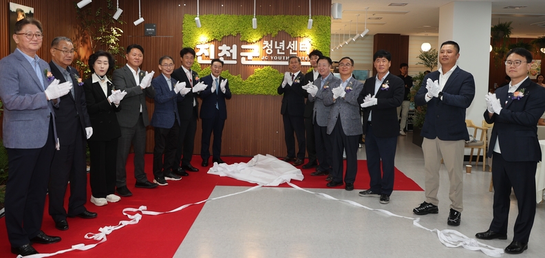송기섭(맨 뒤 왼쪽) 진천군수를 비롯한 충북도의원과 진천군의원들이 16일 진천군농업혁신성장센터에서 진천군청년센터 개소식을 진행하고 있다.
