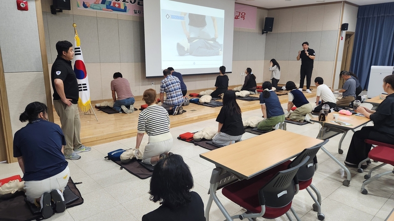 단양군 보건의료원이 의무교육 대상자들애개 자동심장충격기(AED) 사용법과 심폐소생술(CPR) 등 응급처치 교육을 진행하고 있다.