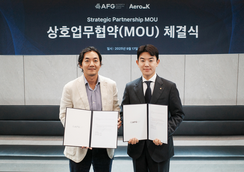 강병호(왼쪽) 에어로케이항공 대표이사와 이승호 어센틱금융그룹 총괄사장이 업무협약을 체결하고 기념촬영하고 있다.