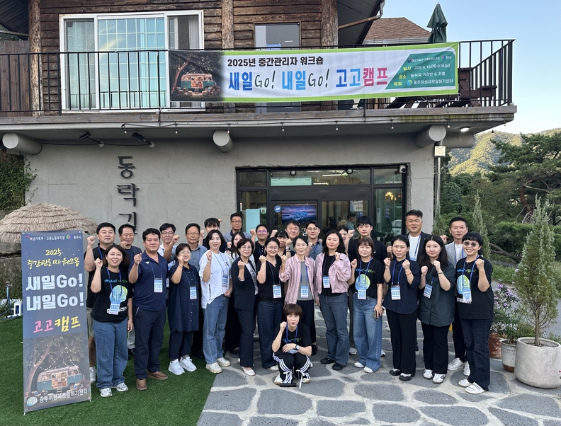 충주여성새로일하기센터에서 마련한 기업 관리자 워크숍 참석자들이 단체사진을 찍고 있다.