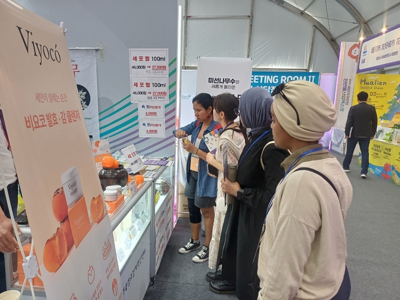 오송글로벌스타트업센터 소속 외국인 창업자 30여 명이 제천 엑스포 산업관을 찾아 전시된 제품들을 살펴 보고 있다.