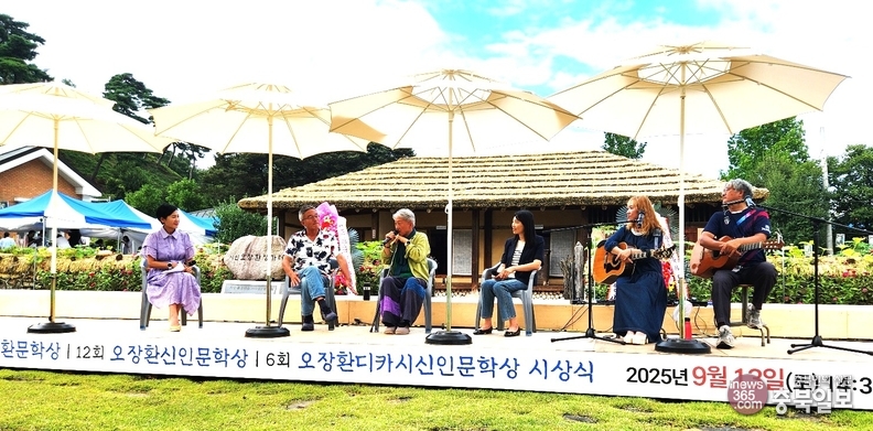 지난 13일 보은군 회인면에서 열린 오장환 문학제 초청 시인과의 북토크와 시노래 공연이 열렸다. (왼쪽부터)최지현 아나운서, 안상학 시인, 박남준 시인, 이운진 시인, 시노래 가수 징검다리.