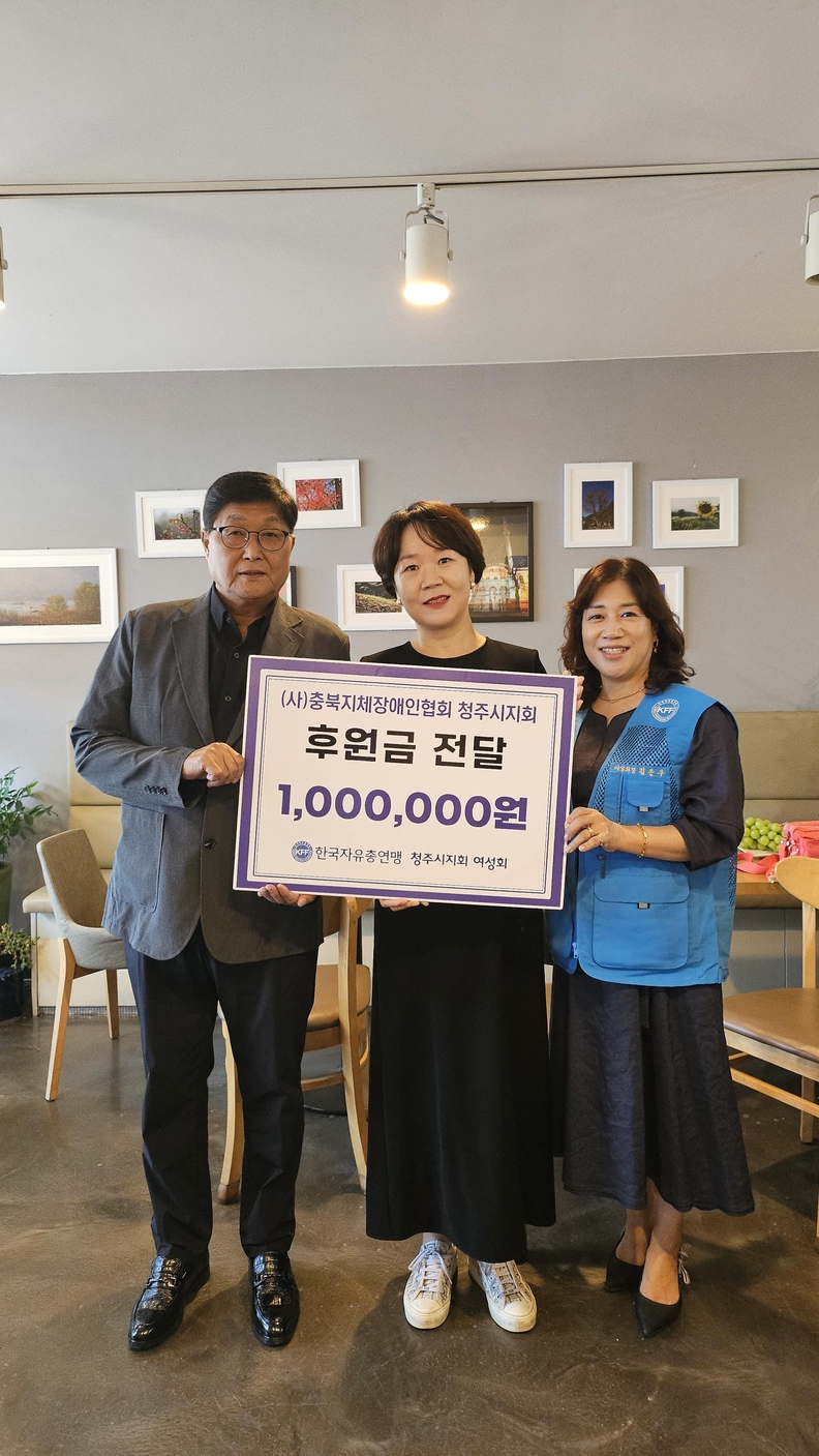 한국자유총연맹 청주시지회 여성회 임원들이 30일 지역 장애인단체를 찾아 게이트볼 대회 참가자들을 위해 써 달라며 성금을 기탁하고 있다.