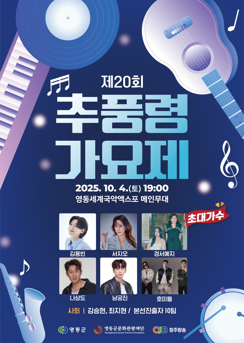 신인 가수들의 등용문으로 자리매김한 추풍령 가요제가 오는 4일(토) 오후 7시, 레인보우힐링관광지 내 2025 영동세계국악엑스포 메인무대에서 열린다.