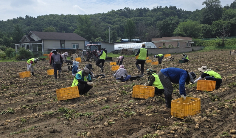라오스 계절근로자들이 보은군 농가에서 감자 수확 작업을 하고 있다. 이들은 농번기 인력난 해소를 위해 남보은농협을 통해 배치된 인력으로, 6월부터 지역 농가의 주요 영농활동을 지원하고 있다.