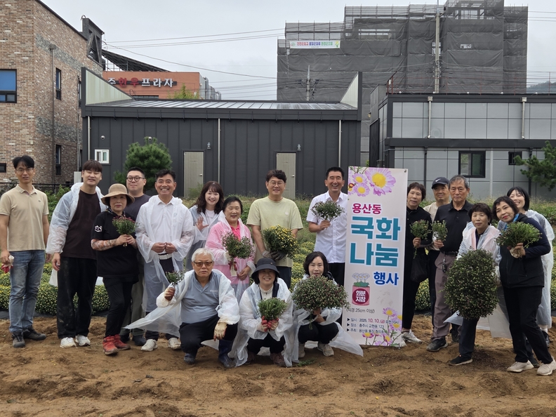 충주시 용산동 통장협의회 회원들이 국화 나눔행사를 연 뒤 단체사진을 찍고 있다.