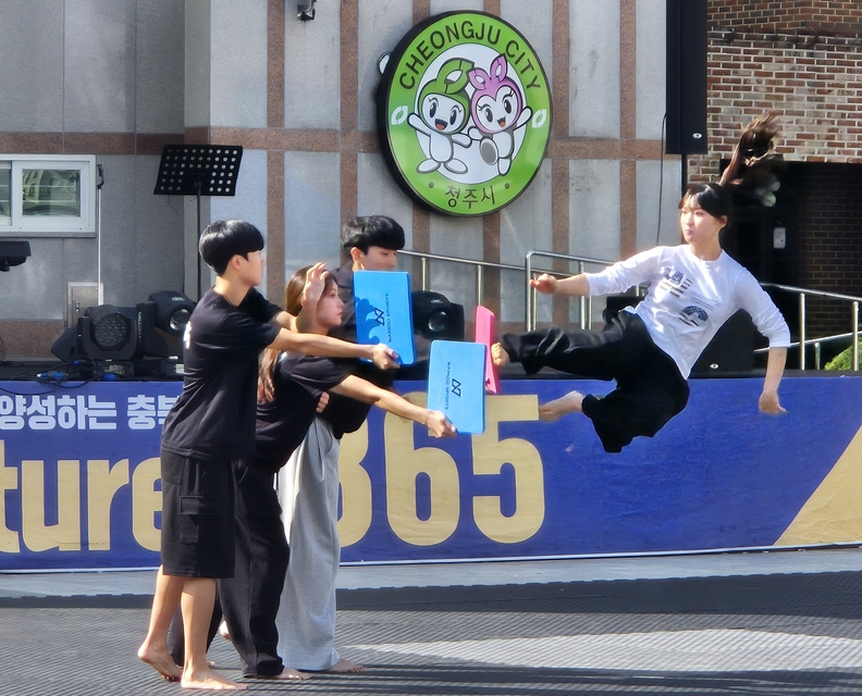 충청대학교 생활체육과 태권도 시범단(화랑단)이 지난 11일 오후 청주시 상당구 북문로2가 청소년광장에서 열린 'K-컬처1365 공연'에서 태권도 시범을 선보이고 있다.