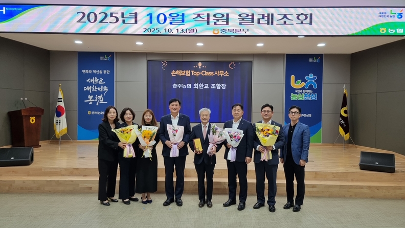 충주농협 관계자들이 농협손해보험 이달의 우수 사무소로 선정된 것을 기념하며 단체사진을 찍고 있다.