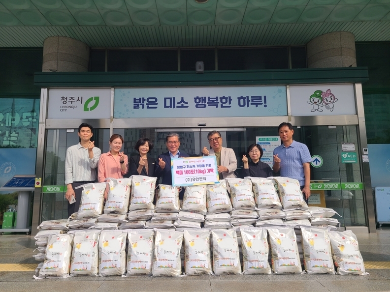 ㈜유한전력 관계자들이 청주시 청원구청에 10kg백미 100포를 전달하고 기념촬영을 하고 있다.