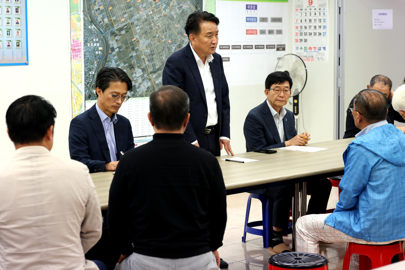 김영환 충북지사가 13일 오송 지역 주민들과 만나 궁평2지하차도 참사 추모현판 설치와 관련한 간담회를 하고 있다.