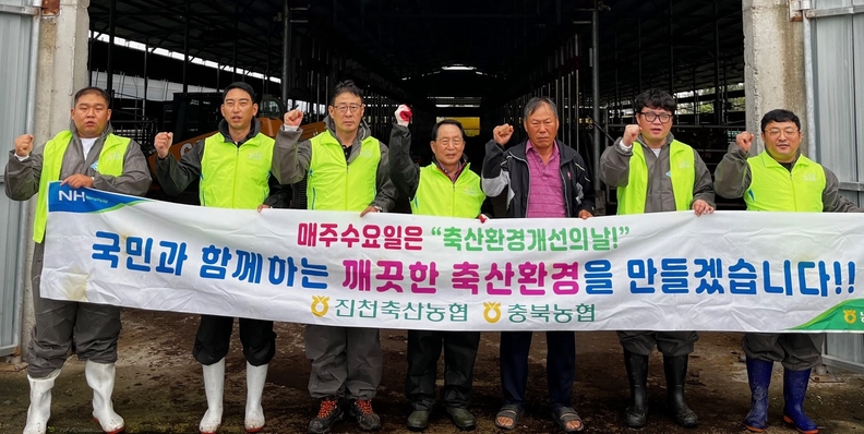 [충북일보] 진천축협(조합장 박승서) 임직원들이 14일 진천군 초평면 한우농장에서 축산냄새 방지와 환경친화축산환경을 위한 '축산환경개선의 날 캠페인'을 벌이고 있다.