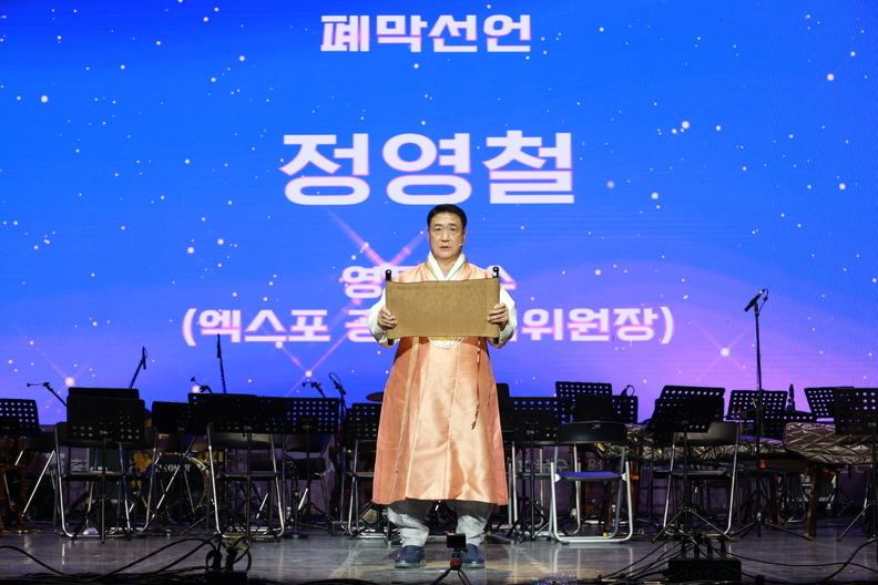정영철 영동군수는 14일 대군민 담화문을 통해 엑스포 성과와 향후 국악문화도시 조성 구상을 밝혔다. 사진은 폐막식 무대에서 공식 폐막을 선언하고 있는 모습.