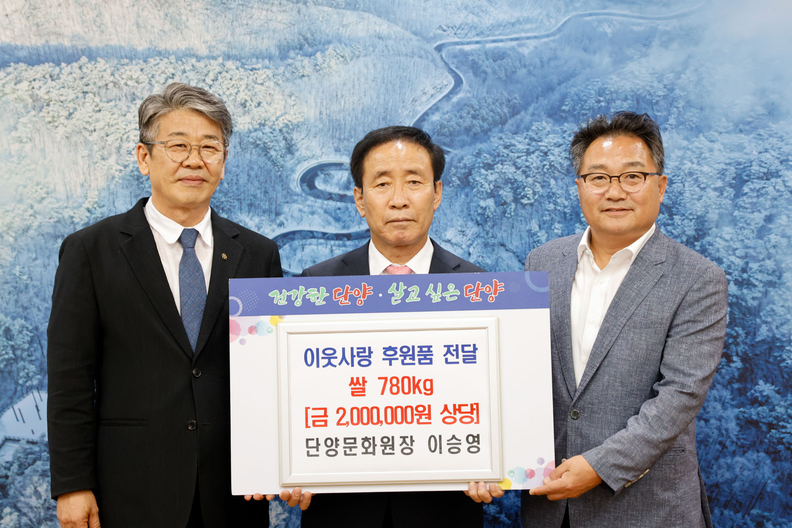 이승영(왼쪽) 단양문화원장이 단양 군수실을 방문해 취임식 축하 화환 대신 받은 쌀 780㎏(200만원 상당)을 지역 내 취약계층을 위해 기부하고 있다.