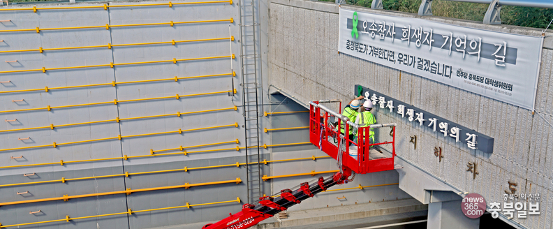 [충북일보] 청주시 오송 궁평2지하차도 참사 희생자를 기리기 위한 추모 현판이 15일 오전 지하차도 양방향 입구 벽면에 설치되고 있다. 추모 현판은 가로 6m, 세로 30㎝ 크기로 제작됐고, '오송 참사 희생자 기억의 길'이라는 글귀를 담았다. / 김용수기자