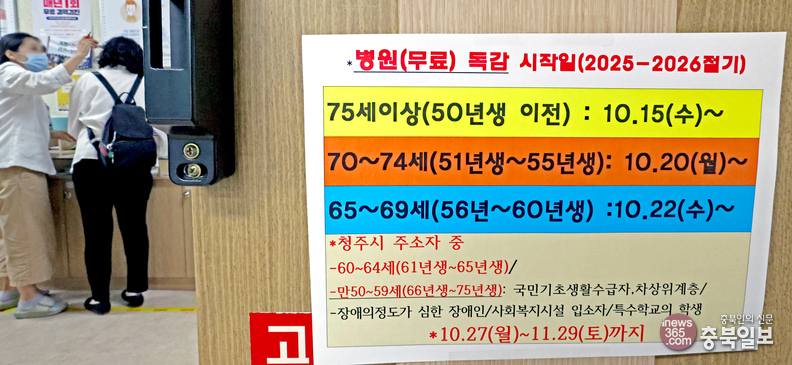 [충북일보] 15일부터 각 지자체의 보건소와 의료 기관 등에서 75세 이상 어르신을 대상으로 독감(인플루엔자)과 코로나19 무료 예방접종이 시작됐다. 청주의 한 보건소 내에 연령별로 순차 진행되는 예방접종 일정 안내문이 게시돼 있다. / 김용수기자