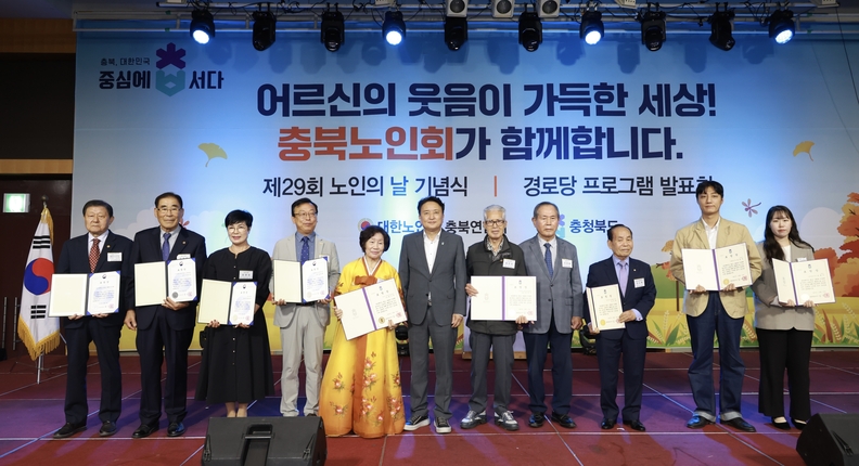 '29회 노인의 날'을 맞아 기념식이 15일 엔포드 호텔에서 열린 가운데 김영환 충북지사와 표창을 받은 유공자들이 기념촬영을 하고 있다.