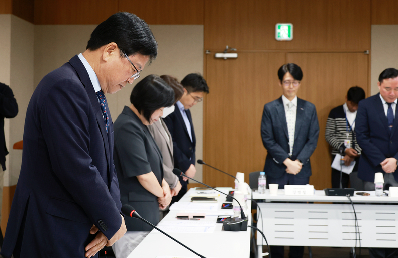 17일 세종시 정부세종청사에서 열린 대학생 해외활동 안전 강화를 위한 긴급 대응회의가 열린 가운데 회의를 주재한 최교진(왼쪽) 교육부 장관과 참석자들이 캄보디아에서 사망한 피해자를 위한 묵념을 하고 있다.