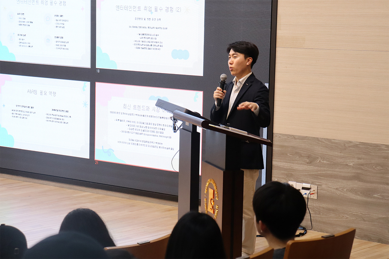 윤영삼 호원대학교 K-팝학부 교수가 지난 16일 서원대학교 미래창조관 세미나실에서 '광고홍보학과 학생들이 알아야 할 엔터테인먼트 회사의 모든 것'를 주제로 특강을 하고 있다.