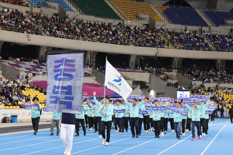 충북선수단이 17일 106회 전국체육대회 개회식이 열린 부산 아시아드주경기장에 입장하고 있다.
