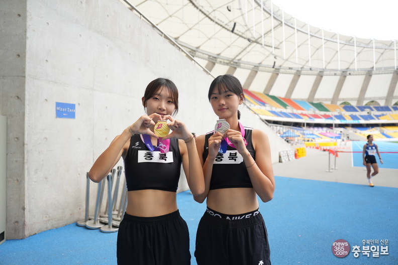 106회 전국체육대회 육상 여자 고등부 높이뛰기에서 각각 금·은메달을 따낸 김연우(왼쪽)·안소연 선수가 손하트를 만들어보이고 있다.