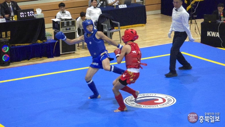 20일 부산 동의과학대학교 석당문화관에서 열린 우슈 산타 남고부 -60㎏ 결승전에서 강희준(왼쪽·비룡관 2) 선수가 경북의 구문성 선수와 겨루고 있다.