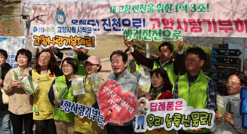 송기섭(앞줄 가운데) 진천군수가 지역 기관·단체 관계자들과 고향사랑기부제 홍보활동을 펼치고 있다.