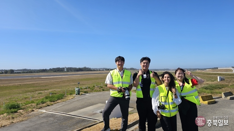 포르투공항 활주로에서 취재진과 공항관계자가 기념촬영하고 있다.