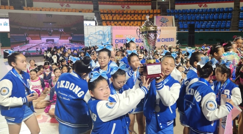 진천 옥동초 치어리딩팀 학생들이 지난 1일 서울 잠실학생체육관에서 열린 ‘18회 전국학교스포츠클럽축전 치어리딩대회’에 출전해 초등부 2위를 차지한 뒤 트로피를 들어올리며 기뻐하고 있다.