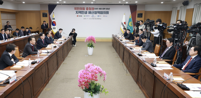 국민의힘이 5일 대전시청에서 충청권 지역민생 예산정책협의회를 개최한 가운데 국민의힘 관계자와 충청권 시도지사 등이 기념촬영을 하고 있다.