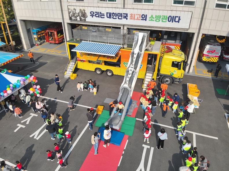 청주서부소방서가 5일 개최한 '2025 어린이 한마당 축제' 참가 아동들이 비상탈출 에어 슬라이드를 체험하고 있다.