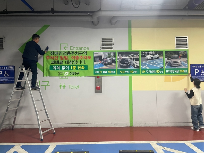 청주시 상당구청 직원들이 장애인전용주차구역 불법주차 근절 홍보물을 부착하고 있다.