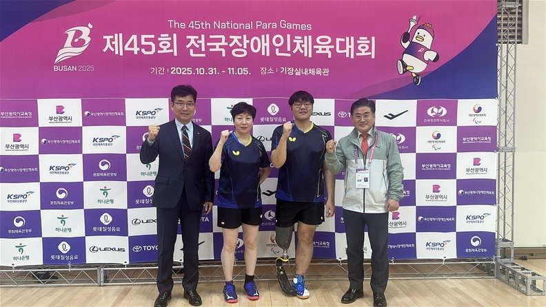윤건영(왼쪽 첫 번째) 충북교육감과 강태원(왼쪽 네 번째) 충북장애인체육회 사무처장이 5일 45회 전국장애인체육대회 탁구 결승이 열린 기장실내체육관을 찾아 김군해(왼쪽 두 번째)·김형권 선수를 격려하고 있다.