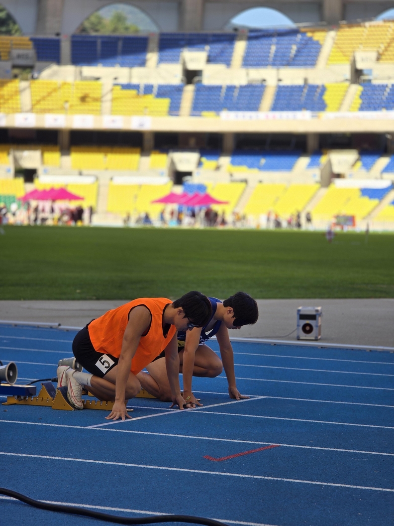 지난 1일 부산 아시아드주경기장에서 열린 45회 전국장애인체육대회 육상 남자 400mB T11에 출전한 김초롱(오른쪽)·정수효 선수가 출발 신호를 기다리고 있다. 두 선수는 이 대회 충북선수단 첫 4관왕에 올랐다.