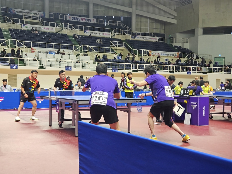 4일 부산 기장실내체육관에서 열린 45회 전국장애인체육대회 탁구 남자 복식 체급 총합18(선수부) 경기에서 충북의 김경섭(왼쪽)·박홍규 선수가 경기에 집중하고 있다.