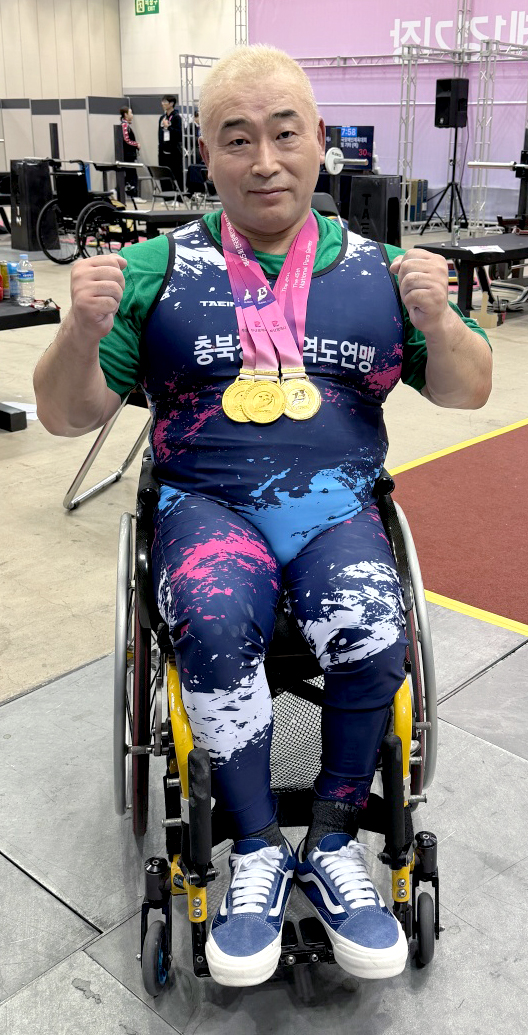 45회 전국장애인체육대회 역도에서 한국신기록 2개, 대회신기록 1개를 써내며 3관왕에 오른 이동섭 선수가 기뻐하고 있다.