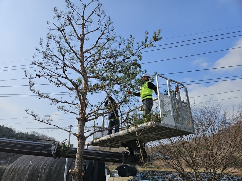괴산군이 동절기 가로수 가지치기를 하고 있다.
