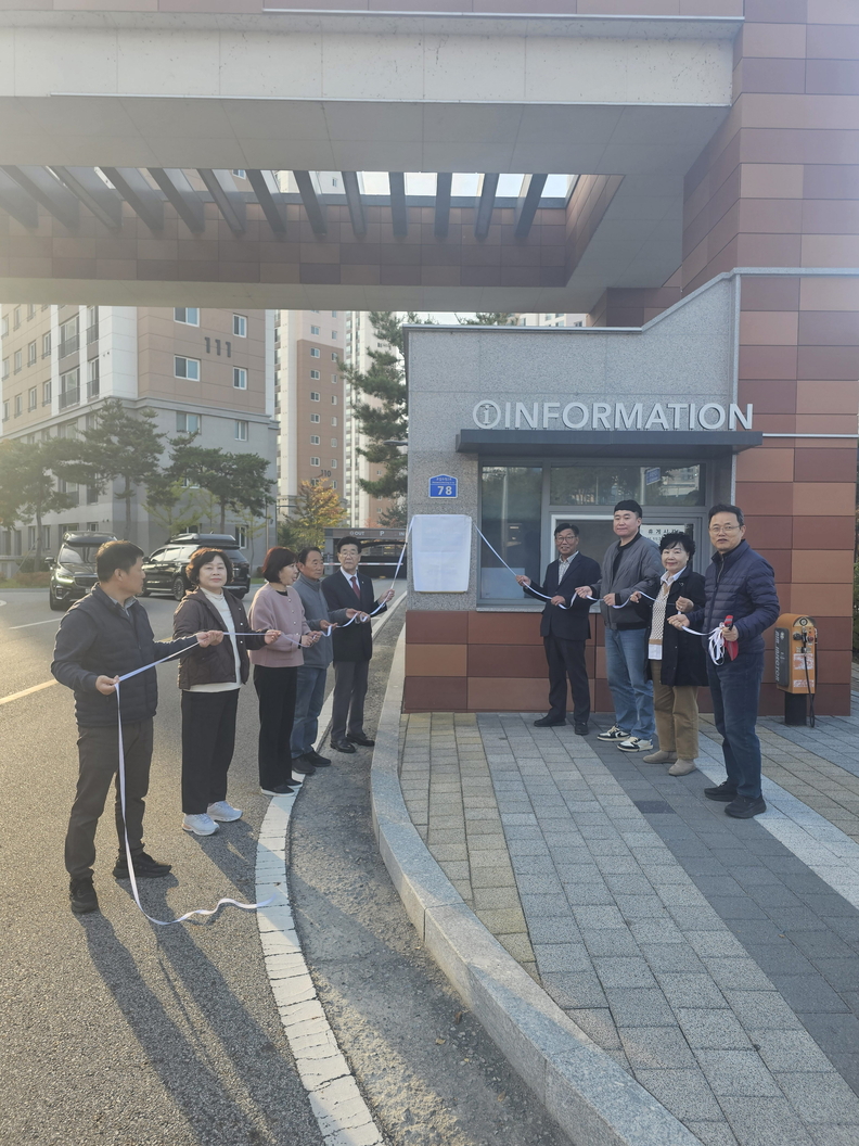 호암두진하트리움아파트 관계자 등이 건강아파트 현판 제막식을 갖고 있다.