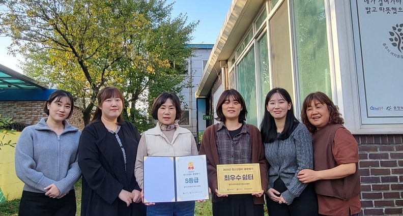 충주시여자중장기청소년쉼터 관계자들이 성평등가족부 종합평가에서 2회 연속 S등급을 받은 뒤 기념사진을 찍고 있다.