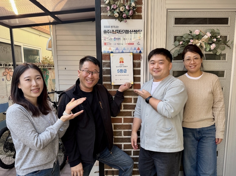충주시남자단기청소년쉼터 관계자들이 성평등가족부 종합평가에서 2회 연속 S등급을 받은 뒤 기념사진을 찍고 있다.