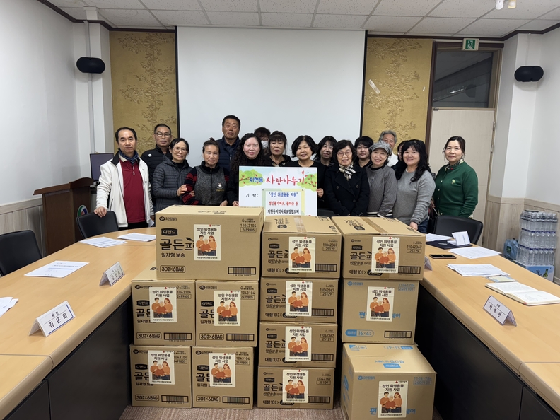 충주시 지현동지사협 관계자들이 성인 위생용품을 지원하며 기념사진을 찍고 있다.