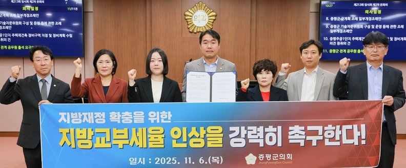 증평군의회 의원들이 6일 열린 213회 임시회에서 '지방교부세율 인상'을 촉구하고 있다.