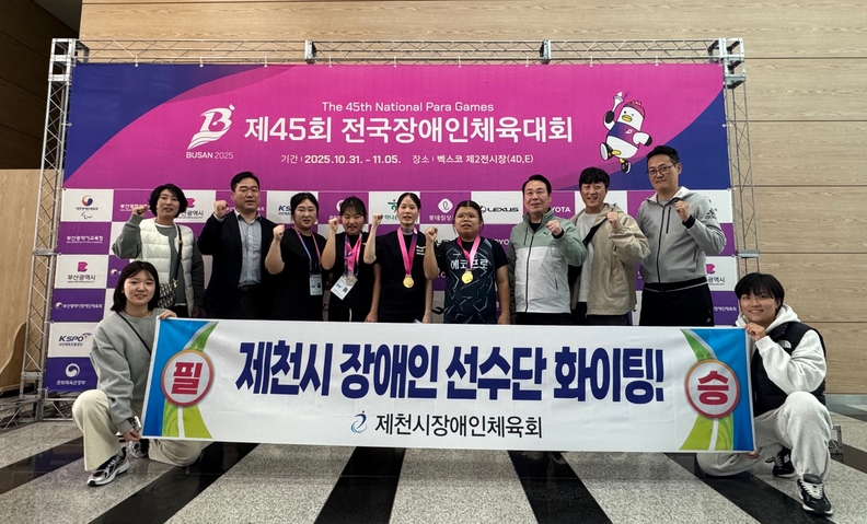 제45회 전국장애인체육대회에 출전해 압도적인 기량으로 금메달 8개를 포함한 총 14개의 메달을 획득한 제천시 선수단.