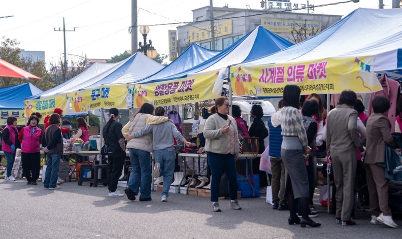 증평군여성단체협의회가 6일 증평여성회관에서 진행한 '우리 함께 아나바다' 행사장에 주민들이 몰려들고 있다.