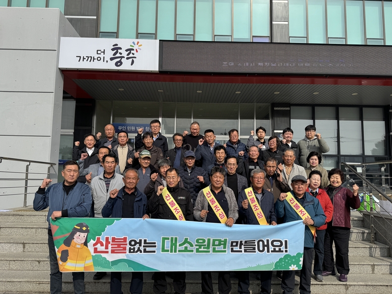 대소원면 이장협의회 회원들이 가을철 산불 예방 홍보 캠페인을 전개하며 단체사진을 찍고 있다.