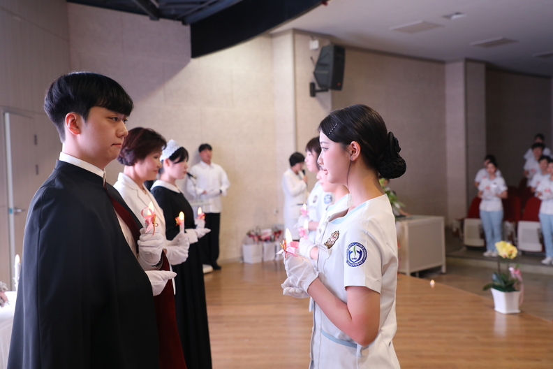 6일 충북보건과학대학교 미네르바홀에서 '14회 나이팅게일 선서식'이 열린 가운데 간호대학 2학년 학생들이 촛불을 들고 간호사로서의 윤리와 헌신을 다짐하고 있다.