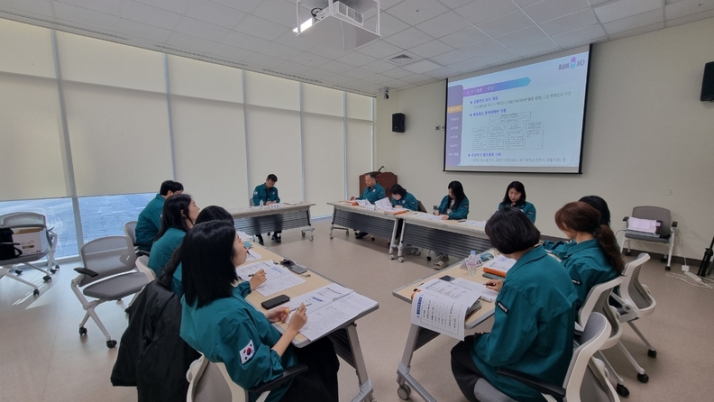 충북도는 지난 7일 도의회 회의실에서 원인불명 질병 집단감염 대응 모의훈련을 실시한 가운데 참석자들이 위기경보 단계별 조치 매뉴얼에 대해 토의하고 있다.