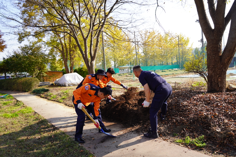 충북소방본부 직원들이 지난 7일 63주년 소방의날을 기념해 청주 혜능보육원을 찾아 환경정리 등 봉사활동을 하고 있다.